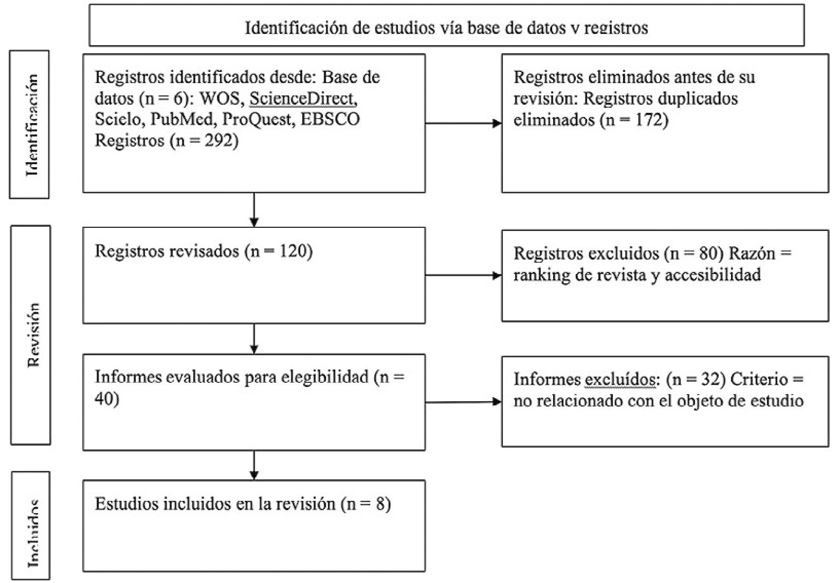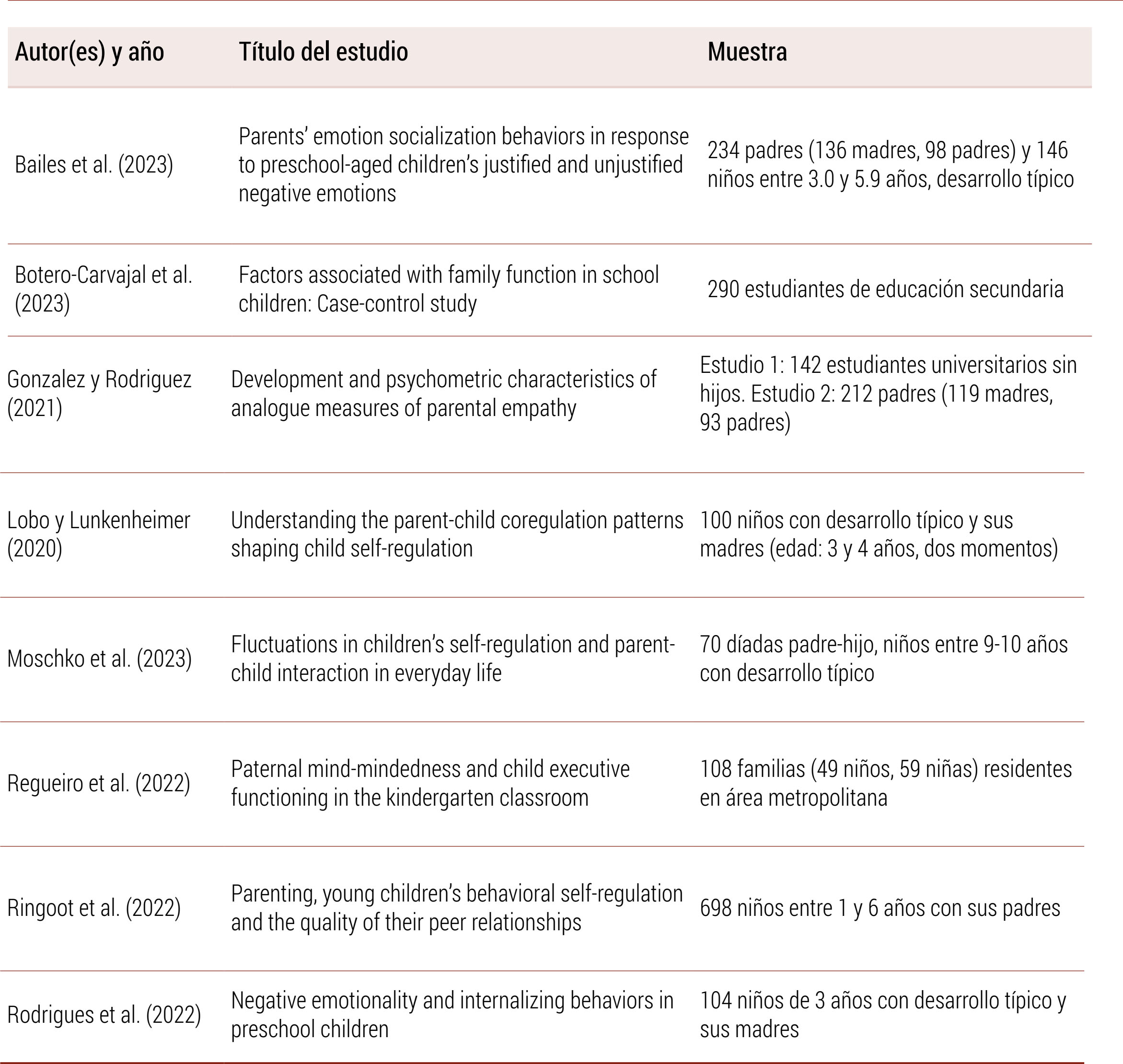 Los niños, desde pequeños, se encuentran inmersos en un contexto social en el que los cuidadores, junto con la constante interacción, cumplen un papel fundamental en el desarrollo cognitivo y socioemocional del niño, siendo las interacciones apreciadas las que generarán, por ejemplo, mayores intercambios de afecto y empatía (Lee et al., 2022; Tissot et al., 2021). Las funciones ejecutivas (FFEE) son procesos mentales de orden superior que permiten controlar la conducta utilizando información previamente procesada (Regueiro et al., 2022), perfeccionándose mediante dos factores: la maduración progresiva cerebral y la estimulación ambiental (Koşkulu-Sancar et al., 2023). Algunos autores (Cristofori et al., 2019; Diamant y Smet, 2024; Diamond, 2020) consideran que las FFEE abarcan diversas habilidades, como la memoria de trabajo, un sistema cognitivo con la capacidad de almacenar e integrar información en el transcurso de alguna situación específica o actividad compleja para aplicarla durante su desarrollo, flexibilidad cognitiva, que facilita el pensamiento adaptativo frente a distintas responsabilidades, acciones o situaciones, y control inhibitorio, que actúa como la regulación de forma consciente del comportamiento, evitando conductas impulsivas (Noten et al., 2020). A los efectos de esta revisión sistemática, se hará énfasis en la capacidad de control inhibitorio (CI), una faceta clave de las FFEE (Fazel et al., 2024; Rodrigues et al., 2022) que permite suprimir estímulos, respuestas inapropiadas y pensamientos irrelevantes para alcanzar objetivos deseados (Rincón-Pérez et al., 2021; Simpson y Carroll, 2019). Debido a estas características, el CI destaca por su importancia en el rendimiento escolar y en el comportamiento socioemocional de los niños escolarizados, dado que es un predictor de conductas adaptativas en la etapa de la infancia (López et al., 2021; Zamora et al., 2020). Se entiende por cognición social (CS) al conjunto de procesos que integran el procesamiento de información necesaria para generar, mantener o regular interacciones sociales (López-Riquelme et al., 2022; Ziv y Arbel, 2020) en los cuales, gracias al intercambio de señales, se intercambia información entre los individuos y su entorno, permitiendo que el ser humano pueda originar una realidad compartida con los demás y adaptar sus distintas respuestas y actitudes basándose en esta realidad (Filley, 2020; Labbé et al., 2019). Según Loubat y Astudillo-Zúñiga (2019), la CS consta de distintas dimensiones, que se denominan (i) procesamiento emocional, que permite percibir y utilizar emociones, (ii) percepción social, útil para poder decodificar e interpretar claves sociales que se encuentran insertas en los gestos comunicativos de los demás, (iii) conocimiento social, factor clave para que el ser humano sea capaz de identificar esquemas sociales y tener una conciencia de roles, normas y objetivos de algunas situaciones sociales, (iv) estilo atribucional, que se aprecia en cómo las personas explican las causas de los resultados positivos y negativos en su vida, y (v) teoría de la mente, que se manifiesta en cómo representan las personas los estados mentales propios y de los demás. De esta forma, el concepto de empatía se relaciona con algunas de las dimensiones de la CS (Gallant, et al., 2020), definiéndose como la capacidad de comprender el estado mental de otra persona sin necesidad de compartir estados emocionales (Silva y Panciera, 2023). Diversos autores (Chen et al., 2020; Hughes et al., 2023; Ringoot et al., 2022) reconocen que para el desarrollo de los niños en sus distintas áreas es importante la interacción entre ellos y sus cuidadores. Es en este contexto en el que surge la pregunta: ¿hay en la actualidad pruebas de las dimensiones de la cognición social de los cuidadores y la influencia en el desarrollo del control inhibitorio en niños escolarizados? El objetivo principal de esta revisión sistemática es sistematizar investigaciones referidas a las dimensiones de la cognición social de los cuidadores y la influencia en el desarrollo del control inhibitorio en niños escolarizados con basándose en la búsqueda de antecedentes de investigación científica, en la cual es indispensable sintetizar y evaluar críticamente las pruebas acumuladas. Esta revisión sistemática se llevó a cabo conforme a las directrices PRISMA (Page et al., 2021), cumpliendo específicamente con los ítems 1-8, 10b, 13a, 16a, 17, 19, 20c, 23d, 26 y 27. Su objetivo era sistematizar investigaciones empíricas que abordaran las dimensiones de la cognición social de los cuidadores y su influencia en el desarrollo del control inhibitorio en niños escolarizados, con el fin de sintetizar y evaluar críticamente las pruebas científicas disponibles en esta área. Para conseguirlo se diseñaron ecuaciones de búsqueda específicas adaptadas a cada base de datos, combinando términos mediante operadores booleanos (AND, OR). Un ejemplo de la ecuación utilizada fue: (“social cognition” OR “empathy”) AND (“caregivers” OR “parents”) AND (“inhibitory control” OR “executive functions”) AND (“children” OR “school children”). Las estrategias se ajustaron según los descriptores controlados o indexaciones disponibles en cada motor de búsqueda. La búsqueda se llevó a cabo entre enero y marzo de 2024 e incluía estudios publicados entre enero de 2019 y diciembre de 2023, priorizando investigaciones recientes con acceso a texto completo en idioma inglés o español, en seis bases de datos: Web of Science (n = 94), ScienceDirect (n = 33), SciELO (n = 2), PubMed (n = 63), ProQuest (n = 25) y EBSCO (n = 75), obteniéndose un total de 292 artículos. Dos revisores de modo independiente llevaron a cabo la selección de los estudios. Las discrepancias fueron discutidas hasta alcanzar consenso. No se utilizaron herramientas automatizadas en esta etapa. La extracci