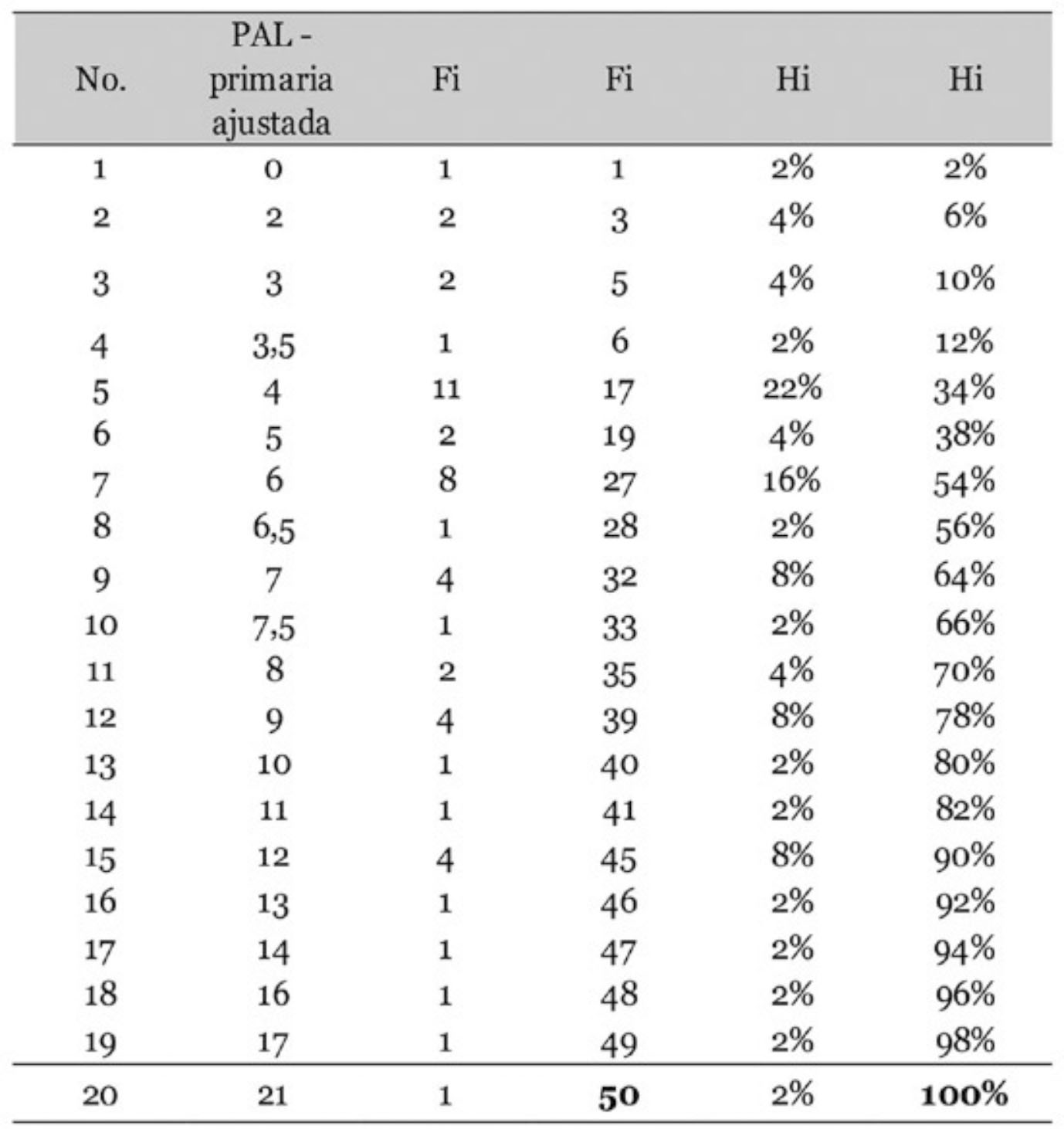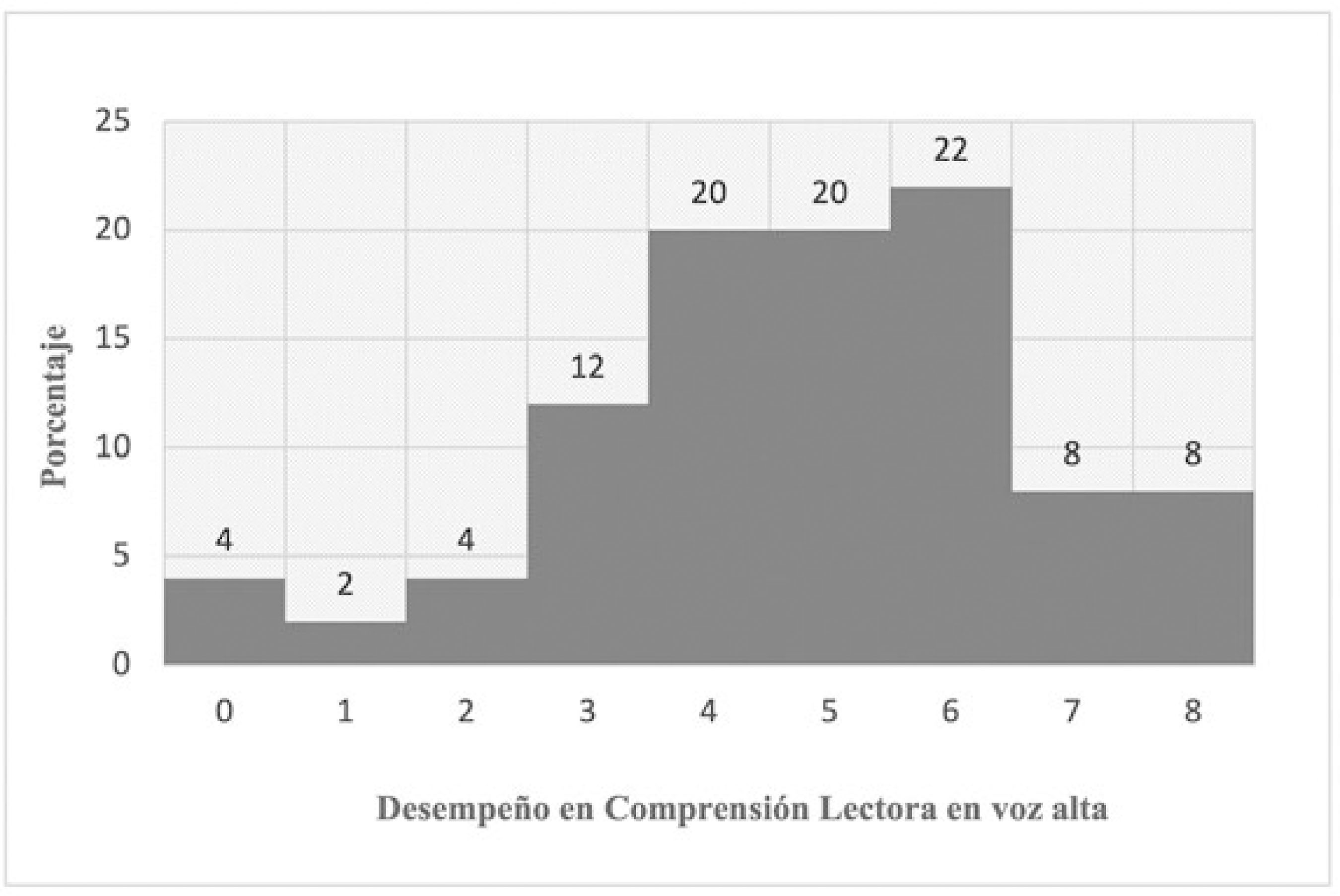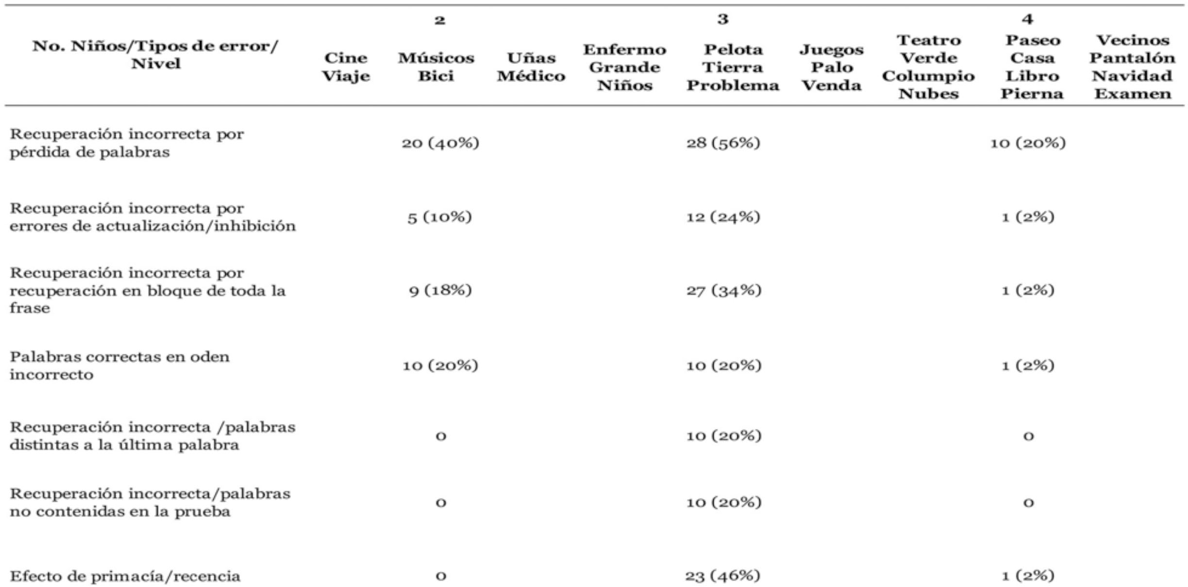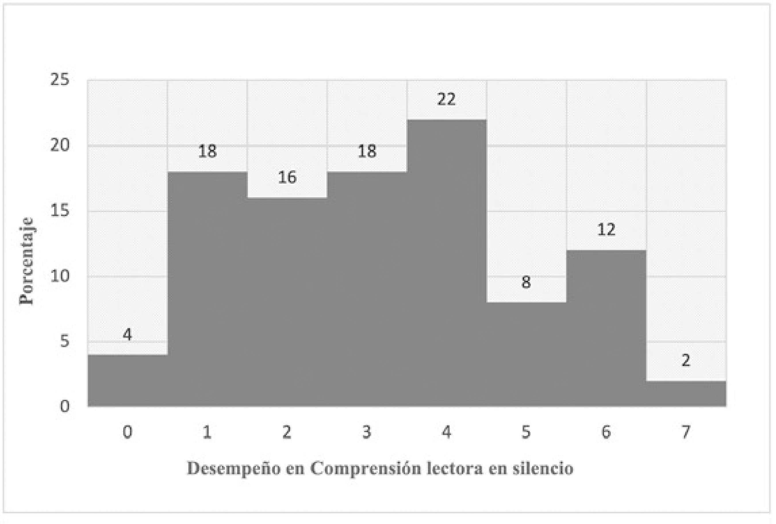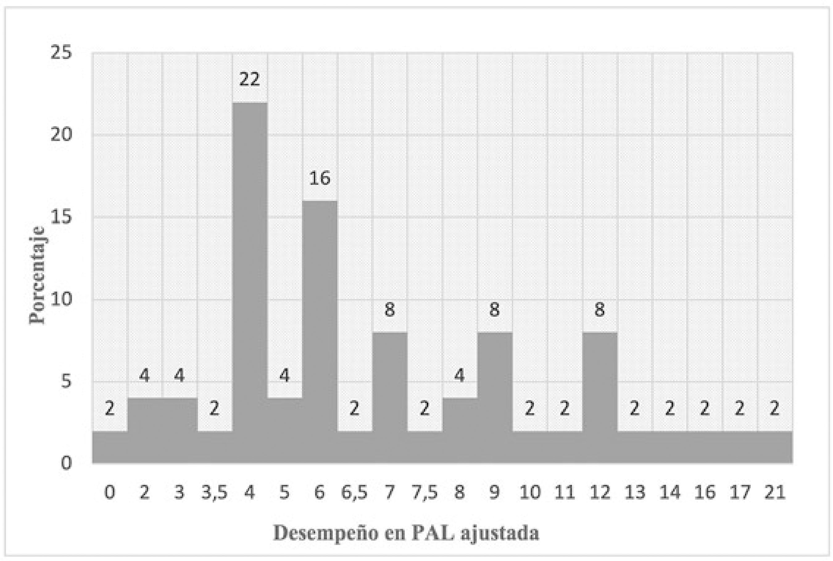Fase de Aplicación La fase de aplicación incluyó la realización de un taller de asentimiento con los niños y una reunión para la obtención de consentimientos informados por parte de los padres y cuidadores, así como la aplicación de instrumentos. Fase de Documentación Se aborda el análisis estadístico y la discusión de los resultados. Por tratarse de un estudio descriptivo, se utilizaron estadísticos descriptivos, frecuencias en porcentajes y correlaciones entre las medidas obtenidas con la aplicación de Coeficiente Rho de Spearman, adecuado para distribuciones no paramétricas. Resultados Obtenidos en PAL Primaria Ajustada Los resultados obtenidos por el grupo en PAL Primaria Ajustada llaman la atención en varios sentidos (Tabla 6, Figura 1). El desempeño tuvo una distribución asimétrica positiva de naturaleza platicúrtica por el rango de dispersión de los datos. Lo anterior está asociado con el predominio de puntuaciones por debajo de la media (7,19). Así, un 64% de los niños solo llegó a una puntuación general de 7. Más aún, un 34% solo alcanzó una puntuación general de 4, que es el equivalente a la moda de la distribución (Figura 1). Con estos datos se comprende la razón por la que el 76% de los niños solo alcanzó el nivel 2 de la prueba, es decir, la capacidad de procesar correctamente dos frases y almacenar las dos palabras finales de cada una, al menos en dos de las tres oportunidades ofrecidas por la serie (Tabla 3). Las exigencias impuestas a nivel de procesamiento de las frases y simultáneamente el logro del almacenamiento de la última palabra de cada frase en su respectivo orden de aparición ponen en evidencia un reto de precisión en la manipulación de la información, característico de la MT. Así lo expresan Gathercole y Alloway (2007) cuando refieren que: “A la menor distracción, tal como la intrusión de un pensamiento que irrumpa de repente o diversas interferencias ambientales, con alta probabilidad pueden resultar en una pérdida de la información; que terminará en el fracaso del cálculo pretendido. Por más esfuerzos que se hagan para la recuperación del material, el único curso de acción que quedará será iniciar de nuevo la tarea” (p. 3). Los resultados para PAL Primaria Ajustada se sintetizan en la Tabla 9. La prueba penaliza la pérdida de palabras, error que se presentó con frecuencia. Así, hubo pérdida de palabras en un 40% de los niños al menos en una ocasión durante el nivel 2 y en un 56% de los niños al menos en una ocasión durante el nivel 3. El orden incorrecto de palabras se presentó en un 20% de los niños tanto en el nivel 2 como en el nivel 3. La recuperación incorrecta de palabras estuvo asociada en algunas ocasiones a la dificultad para actualizar acertadamente durante la prueba. Por ejemplo, en la serie 1 del nivel 3, las palabras a recuperar son: enfermo, grande, niños y en la siguiente serie: pelota, tierra, problema. Una ejecución incorrecta para esta última sería: enfermo, tierra, problema, en una convergencia de dos dificultades: la no actualización y recuperación completa de la serie vigente; a la vez que una persistencia errática de palabras que fueron útiles para la recuperación de una serie anterior; pero que debiéndose inhibir para la serie en curso, no se logró realizar. Este error se produjo sobre todo en el nivel 3 en un 24% de los niños y en el nivel 2 en un 10%. Un error prevalente para el nivel 3 se produjo por una dificultad para mantener en línea la instrucción correcta sobre la palabra a recuperar: “Guardar la última palabra de cada frase”, que en ocasiones terminó en ejecuciones que respondieron a una instrucción imprecisa: “Guardar una palabra de la frase”, que no necesariamente fue la última. Por ejemplo, en la frase: “Ese libro de dinosaurios es muy grande”, en repetidas ocasiones la palabra recuperada fue “dinosaurios”. Este error se presentó en un 20% de los niños, al menos una vez en el nivel 3. En este caso particular, posiblemente por una influencia de tipo motivacional o por tratarse de una palabra de uso frecuente, sobre todo entre los niños varones, que desvío su atención durante la prueba. Estos errores encajan en lo que denominaron Carreti, Cornoldi, De Beni y Romanó (2005), citados en Butterfuss y Kendeou, (2017), tarea de intrusión retrasada, utilizando la tarea de actualización de Palladino (2001), citado en Butterfuss y Kendeou, 2017), es decir, aquella información que debe ser desechada, cuando deje de cumplir el criterio de mantenimiento (para el caso anterior, la palabra enfermo) y tarea de intrusión inmediata (como en el caso de dinosaurio), que es la información de la que se puede prescindir de inmediato porque no cumple criterio alguno de mantenimiento, errores comúnmente asociados a las dificultades afrontadas por lectores con pobre ejecución. Errores como los descritos atañen a una co-ocurrencia de procesamiento errático tanto de los mecanismos de actualización como de inhibición, que de acuerdo con Carreti et al. (2005) citados en Butterfuss y Kendeou (2017) son procesos diferentes pero interrelacionados. Aún más importante, existe evidencia que respalda la tesis de la inhibición como una FE promotora del desarrollo de otras FE como la actualización y la flexibilidad, pero también de funciones ejecutivas superiores como la planificación (Blair et al., 2005; Carlson y Moses, 2001, citados en Butterfuss y Kendeu, 2017), todas estas de crucial importancia para los procesos de lectura (Borella et al., 2010; García-Madruga et al, 2014; Iglesias-Sarmiento et al., 2015; Kieffer et al., 2013; Miller et al., 2013). Otro error evidenciado durante la aplicación fue la dificultad para la recuperación únicamente de la última palabra, para lo que el niño debe separar la palabra de la frase, como en una especie de fragmentación de “la unidad dentro del todo”. Un 34% de los niños presentaron es