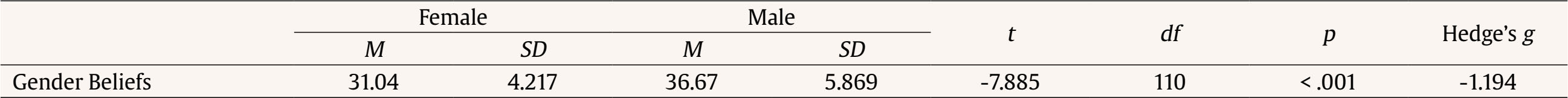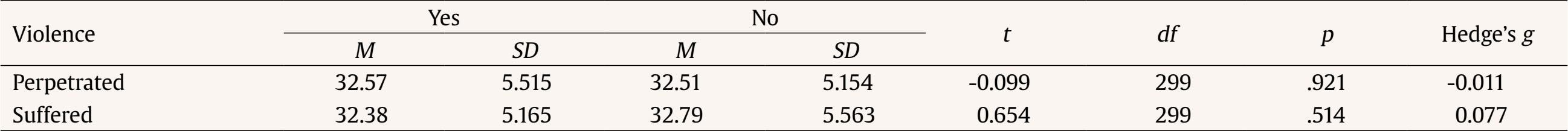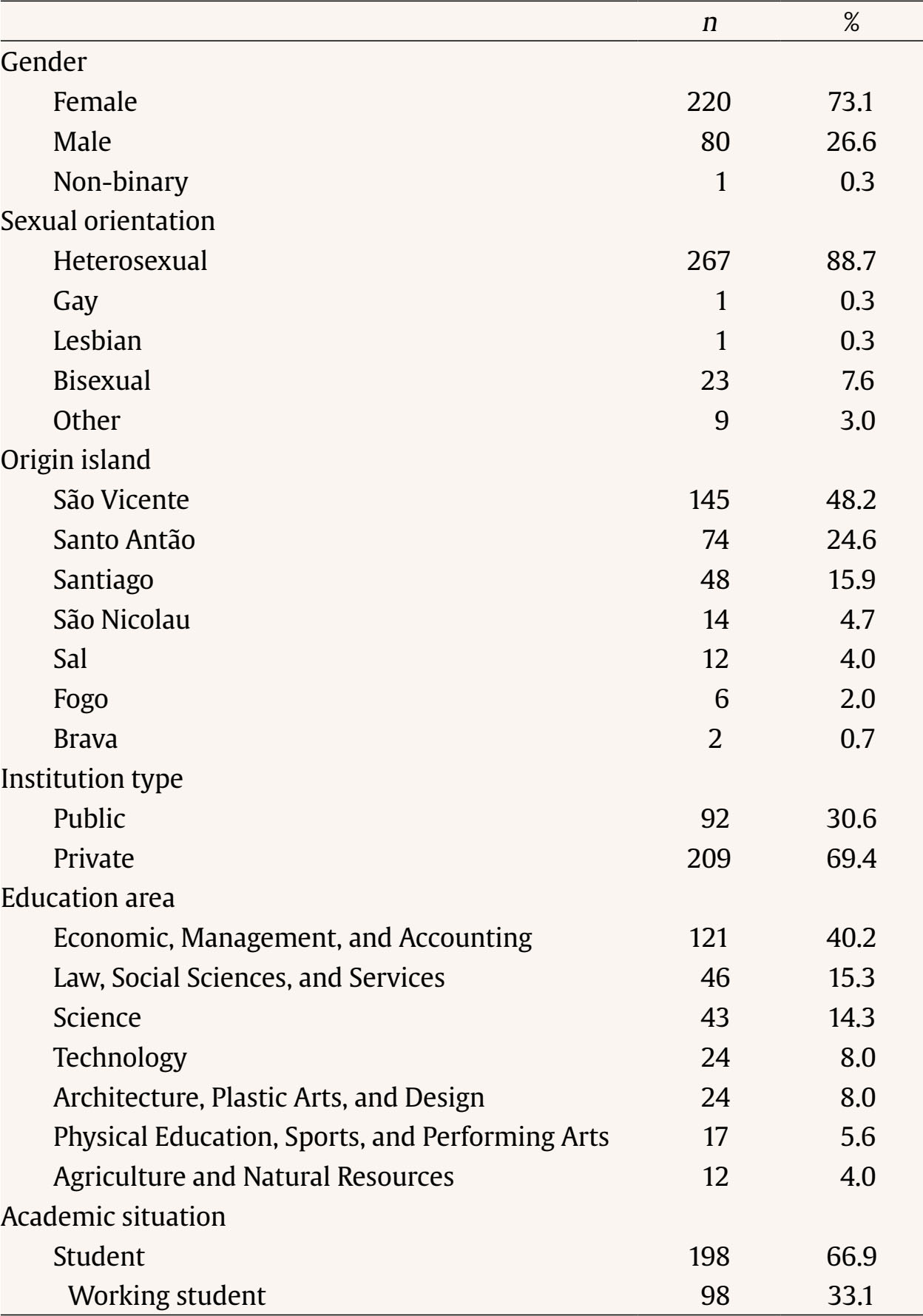 Research Hypotheses Our first hypothesis was that dating violence would reveal no gender differences in terms of victimization (H1). The second hypothesis was that dating violence would be more frequently perpetrated by males than by females (H2). The third hypothesis was that psychological and physical violence would be more prevalent than sexual violence, stalking, and economic violence (H3). The fourth hypothesis was that males would show higher levels of gender beliefs legitimizing dating violence than females (H4). The fifth hypothesis was that participants who suffered violence would exhibit higher levels of gender beliefs legitimizing dating violence than participants who did not suffer violence (H5). The last hypothesis was that participants who perpetrated violence would show higher levels of gender beliefs legitimizing dating violence than participants who did not perpetrate violence (H6). Sample and Procedure The sample consisted of 301 Cape Verdean university students, 220 females, 80 males, and one non-binary person, aged between 17 and 53 years old (M = 23.86, SD = 6.112) (Table 1). Most students were heterosexual (n = 267, 88.7%). Nearly 50% were from S. Vicente (n = 145, 48.2%) and 24.6% (n = 74) were from Santa Antão. Almost 70% (n = 209, 69.4%) attended private universities, 40.2% (n = 121) attended courses in Economics, Management, and Accounting, and 15.3% (n = 46) and 14.3% (n = 43), respectively, courses in Law, Social Sciences, and Services and Sciences. Almost 67% (n = 198 of the participants were full-time students and 33.1% (n = 98) had also a job. The boards of Cape Verde’s universities were contacted via email, informed about the study goals (the characterization of the relationship between gender beliefs and dating violence practices among university students in Cape Verde) and asked to disseminate it among students. Additionally, the study was divulgated through social media accounts, namely Instagram and LinkedIn. Once authorized, Cape Verdean students were invited to fill out an anonymous, confidential online questionnaire. Data was collected between 2021 and 2022. The study met all the ethical standards of scientific research with human beings, the Code of Ethics of the Order of Portuguese Psychologists, and the General Data Protection Regulation. At the end of the questionnaire information on Cape Verdean services aimed to support victims of domestic violence was provided, along with an email of the person in charge of the study to be used if necessary. Instruments The first part of the questionnaire consists of informed consent, followed by sociodemographic questions (e.g., age, nationality, education area), the Inventory of Gender Beliefs, and the Inventory of Violent Juvenile Relationships (Neves et al., 2023). The Inventory of Gender Beliefs assesses participants’ beliefs on gender social relations and contains 24 items on a five-Likert scale (e.g., “Women who don’t want to become mothers aren’t real women”; “Women are victims of sexual violence because they provoke men”; “Women and men must share domestic work”). The sum of the responses to the 24 items of the inventory was used to measure gender beliefs: higher values reflect more conservative beliefs. Cronbach’s alpha value was .737. The Inventory of Violent Juvenile Relationships seeks to characterize psychological, physical, sexual, economic, and social violence and stalking. It is composed of 21 items, with the answer options: “Never happened to me”, “I already suffered”, “I already perpetrated”, and “I already suffered and perpetrated” (e.g., “Force me to have unwanted sex behaviors”; “Keep all my money or limit/control my expenses”; “Threat me verbally or through behaviors causing fear”). Victimization was measured by accounting for the number of “I already suffered” responses, and perpetration was measured by accounting for the number of “I already perpetrated” responses. Persons who responded to at least one item with “I already suffered” or “I already perpetrated” were accounted as victim and/or perpetrator, respectively. The different typologies of violence were defined according to the definitions presented in the literature. The instruments were chosen because the study’s authors used them with reliable results in prior research with similar samples. Statistical Analyses Data were treated and analyzed using Statistical Package for Social Sciences version 28 for Windows. Descriptive and inferential analyses were run, using association and difference tests as inter-subject design tests. Regarding the different sample sizes, Hedge’s g was used to evaluate the effect size of differences in means. The repeated measures ANOVA with Greenhouse-Geisser correction and Cochran’s Q test was also used to analyze differences between violence typologies. A significance level of .05 was assumed to identify statistically significant differences. From the sample, 166 participants referred to being involved in a dating relationship (55.1%) and 115 have been in the past (38.2%). Nearly sixty percent (61.1%, n = 184) admitted having been victims of dating violence, while 46.8% (n = 141) mentioned having perpetrated at least one act of dating violence. Of these, 120 (39.9%) acted simultaneously as victims and perpetrators (65.2% of victims and 85.1% of perpetrators). A statistically significant, moderate, association between victimization and perpetration, was found, χ2(1) = 64.177, p < .001, φ = .462. In terms of victimization, psychological violence was the most expressive (54.8%, n = 165), followed by social violence (27.2%, n = 82), physical violence (13.6%, n = 13.6%), stalking (11.6%, n = 35), sexual violence (10.6%, n = 32), and economic violence (2.0, n = 6), with Cochran’s Q test determining that there was a statistically significant difference in the prevalence of victimization for different types of violence, χ2(5) = 399