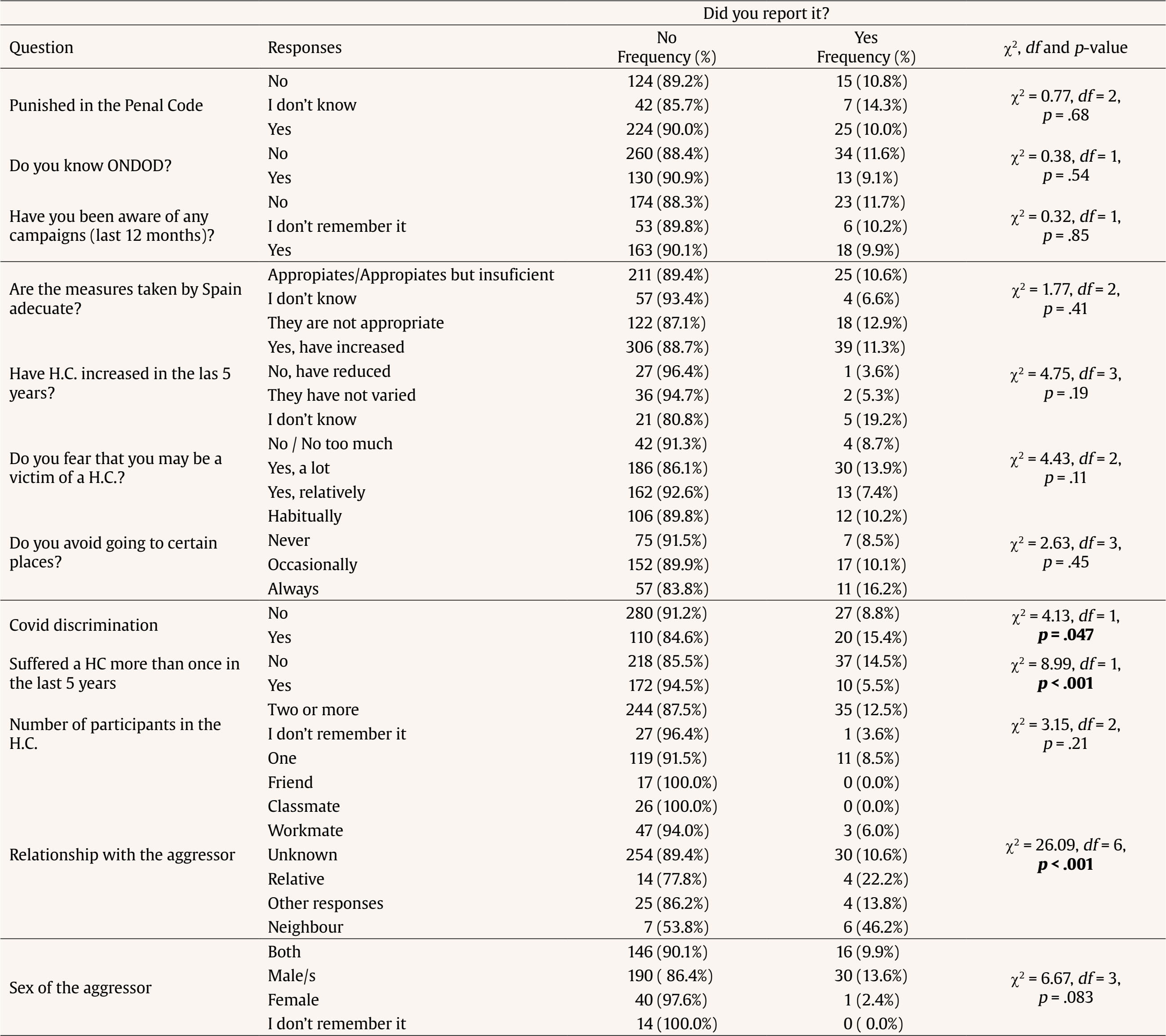 Correspondence: ses.ondod@interior.es (J. Gómez).Over the past few decades, hate crimes have experienced an increasing position in European policy agendas (Perry, 2001; Williams & Tregidga, 2014). Additionally, the European Union has increased the amount of legislation to combat hate crimes and to ensure that victims have a full access to justice and protection resources. An example is the Council Framework Decision 2008/913/JHA on combating certain forms and expressions of racism and xenophobia by means of criminal law. Nevertheless, the protection established by the legislation is maximized if a victimization report to the police is duly delivered by the victims. Without a proper report, the crime may not be adequately prosecuted due to the lack of relevant information or because the victim’s complaint is needed for its prosecution. Underreporting rates are a big problem with different crime typologies, especially sexual crimes (Finkelhor & Ormrod 2001), but is even more significant in crimes related to bias-motivated or hate crimes (Freilich & Chermak, 2013; Pezzella et al., 2019). Reporting rates are still very low and they decrease when minorities are involved (Lantz & Wergen, 2022; Tyler, 2005). Hate Crimes or Bias-motivated Offenses The term “hate crimes” is a subject of debate due to uncertainty about offender motivations and victim characteristics (Garland & Chakraborti, 2012). A central question is whether these crimes are driven by pure hatred or by less intense feelings like prejudice or bias (Lawrence, 2003). Some academics prefer the term “bias crimes” to encompass a broader spectrum of motivations, especially in the United States (Garland & Chakraborti, 2012). Hate crimes reflect a bias in the selection of the victim, based on the perpetrator’s perception that the victim’s group is a “permanent outsider.” The lack of consensus in the definition is due to its use in various contexts, disciplines, and legislations (Schweppe, 2021). Recent psychological theories on prejudice and hate, such as dehumanization and infra-humanization (Haslam & Louhman, 2014; Leyens et al., 2007), help us understand the extreme manifestations of prejudice. Additionally, the multidimensional nature of hate (Sternberg, 2005) suggests that hate can be rooted in prejudice (Dovidio et al., 2005). A broad definition of hate crimes includes offenses motivated by prejudice or antipathy toward a victim’s group based on race, ethnicity, religion, sexual orientation, disability, gender identity, or other similar categories (Iganski, 2001; Perry, 2001). These crimes not only affect individual victims but also entire communities, due to their perceived “outgroup” status. Perry (2001) describes them as “message crimes,” intended to send a threatening message. Hate Crime Prevalence and Underreporting Rates Hate crimes are less frequently reported than non-hate crimes. This has been confirmed by several authors, even if they do not provide specific figures (Levin, 1999; Pezzella et al., 2019; Sandholtz et al., 2013). Previous victimisation surveys have shown that there are differences in the rates of hate crime victimization, in different geographical contexts. In the United States Bureau of Justice Statistics [BJS, 2021], data reported by respondents to the National Crime Victimization Survey (NCVS) showed that the rate of violent hate crime victimization in 2019 was 0.1% of respondents aged 12 or older. Additionally, 90% of hate crimes recorded by the NCVS were violent crimes and 10% were property crimes. In terms of reporting rates, about 44% of hate victimizations were reported to the police, and these practices increased with the severity of the victimization. In the European context, results of the International Crime Victims Survey (ICVS) (Kesteren, 2016) showed that, on overage, 2.8% of the West European population said they had been a victim of hate crime in 2004. The highest percentages were found in France, Denmark, Luxembourg, Belgium, The United Kingdom, and The Netherlands (above 4%). Rates of hate crime below 2% were found in Finland, Italy, Portugal, Greece, and Austria (Van Dijk et al., 2008). Regarding the immigrant population, ICVS in 2005 showed that they were over-victimized in comparison to non-immigrants. The immigrant population experienced a disproportionately higher rate of victimization, with 10% reporting being victims compared to 2% of non-immigrants (Van Dijk et al., 2008). Unfortunately, we do not have victimization surveys in Spain showing similar results. Victimization surveys conducted by the European Union Agency for Fundamental Rights (FRA) found that between 30% and 49% of respondents had experienced some form of bias-motivated harassment and between 9% and 22% had experienced physical violence in the five years prior to the surveys. There are differences between certain groups in the EU. For example, while 9% of respondents overall had experienced physical violence in the five years prior to the survey, the proportion was higher among respondents belonging to an ethnic community (22%), respondents who identify as lesbian, gay or bisexual (19, and respondents who are severely restricted in their usual activities due to a disability or health problem (17%) (European Union agency for Fundamental Rights [FRA, 2021]). In relation to the reporting rates, FRA surveys consistently reveal a very low number of incidents of bias-motivated violence and harassment reported to any organization, including the police. Although incidents of bias-motivated violence are more often reported than the incident of bias-motivated harassment, the vast majority of physical attacks still remain unknown to the police. Less than one-third (30%) of respondents across the EU reported to the police the most recent incident of physical violence in the five years before the survey (FRA, 2021). The second European Union Minorities and Discrimination Survey (EU-MIDIS II) shows that 