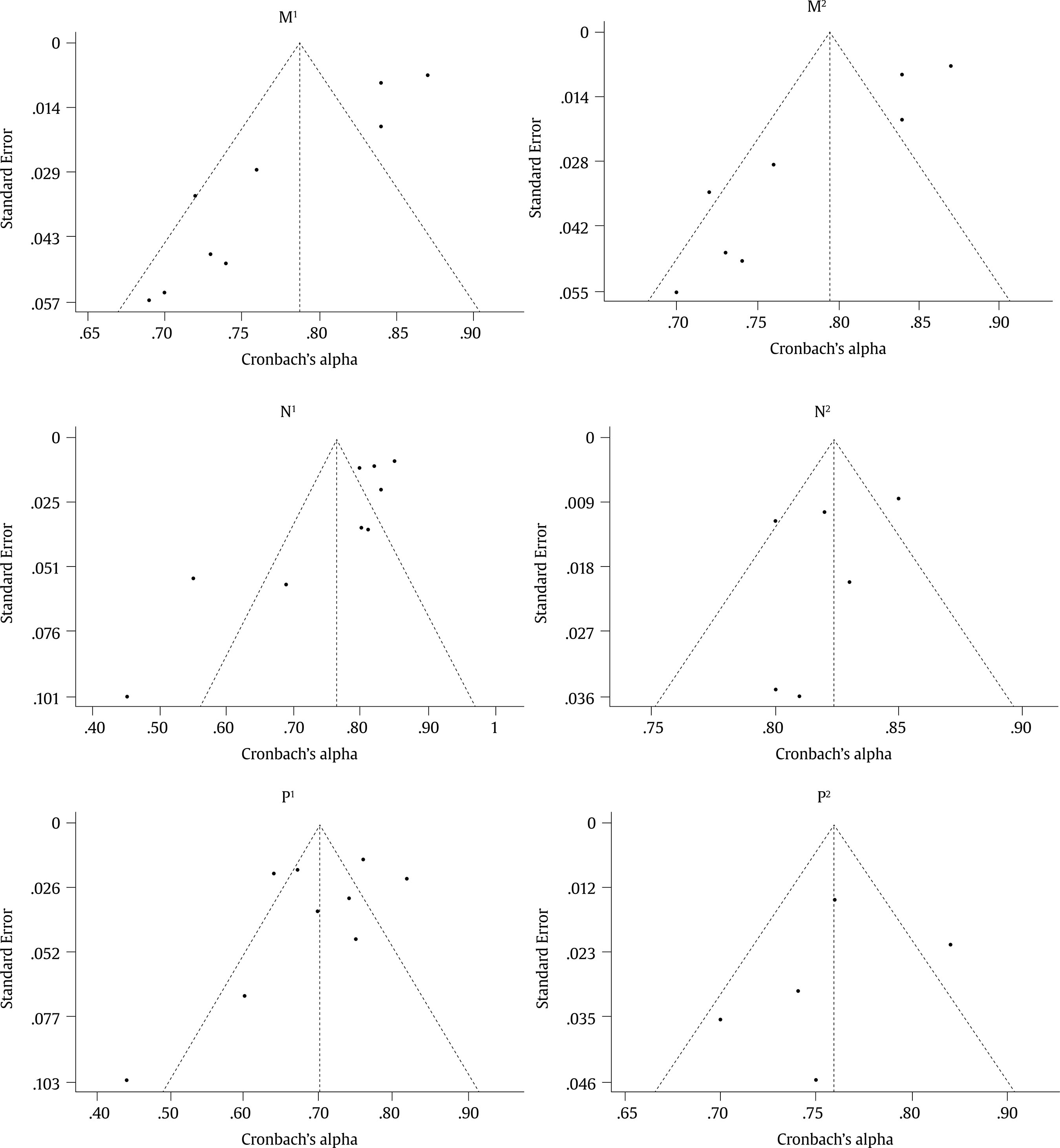 Este trabajo explora la fiabilidad de los instrumentos de evaluación empleados en población penitenciaria para medir la Tríada Oscura, constelación de rasgos de personalidad que incluye el maquiavelismo, el narcisismo y la psicopatía. Se realizó una revisión sistemática de la literatura en seis bases de datos, seleccionando doce artículos acordes a los criterios de elegibilidad. Se llevó a cabo un metaanálisis de generalización de la fiabilidad de alfa de Cronbach, que mostró una consistencia interna aceptable (≥ .70) en las tres subescalas, siendo el maquiavelismo el que mejor alfa estimada tenía y una buena consistencia interna (≥ .80) en el Dirty Dozen, la escala más utilizada en este contexto. Sin embargo, la escasez de estudios, el sesgo de la publicación y la gran heterogeneidad reflejada en el estadístico Q de Cochran y el índice I2 (≥ 75%) ponen en peligro la generalización de las estimaciones y subrayan la necesidad de examinar qué variables moderadoras influyen en esta variabilidad.