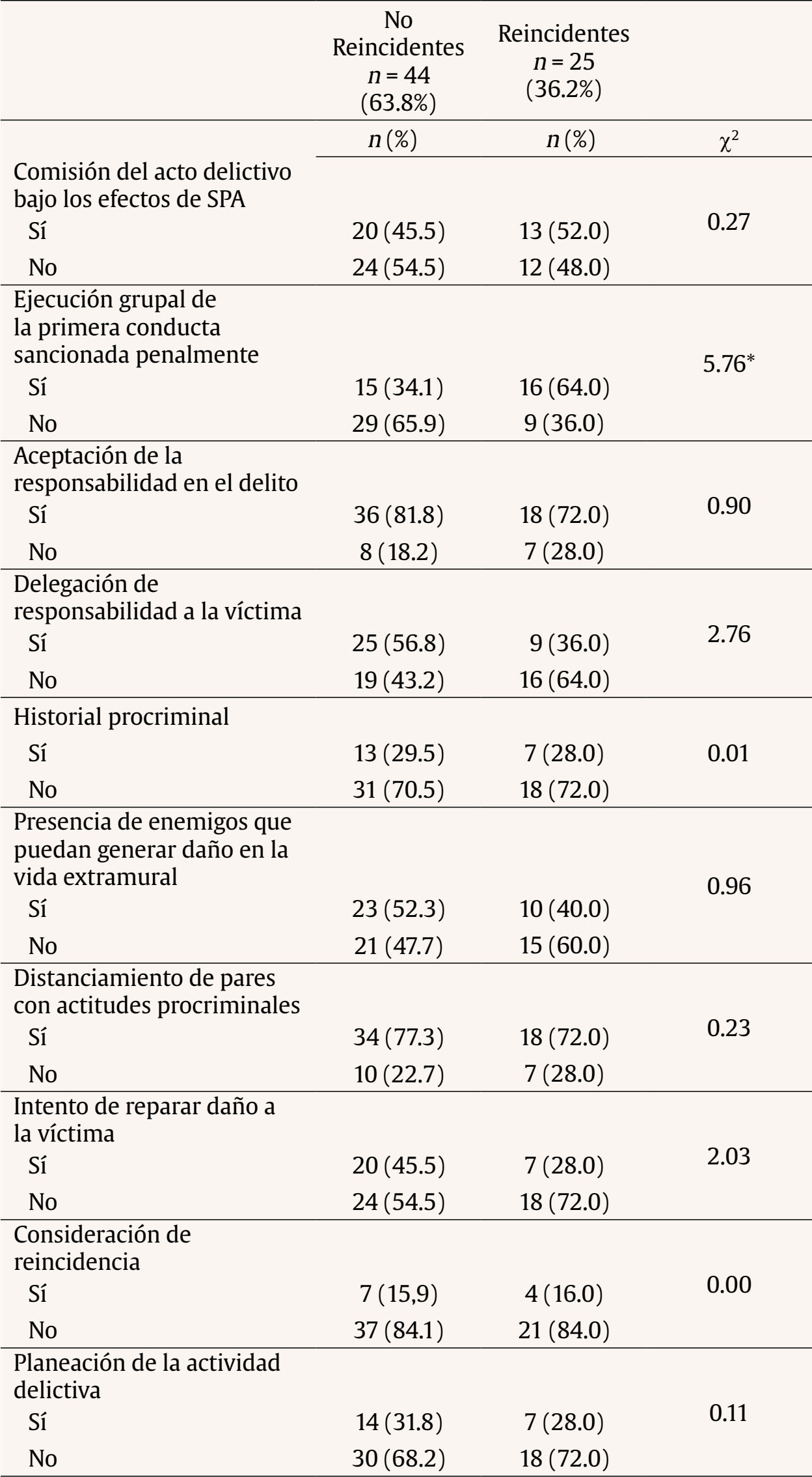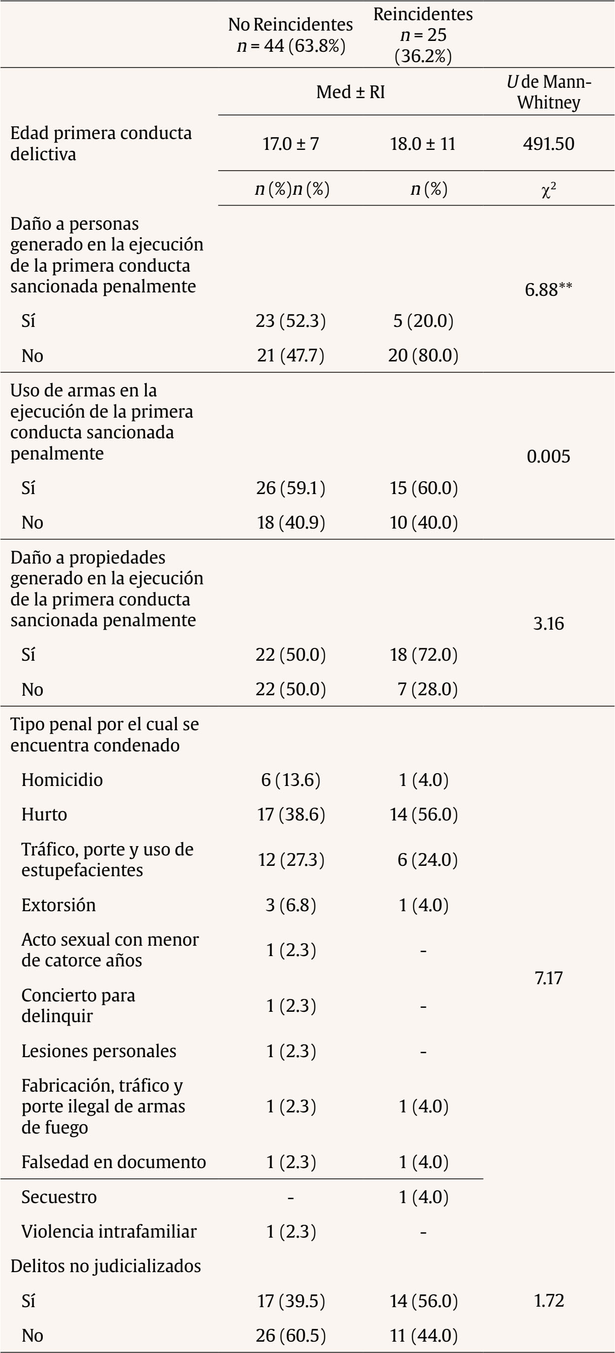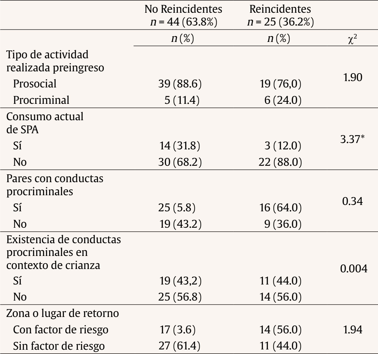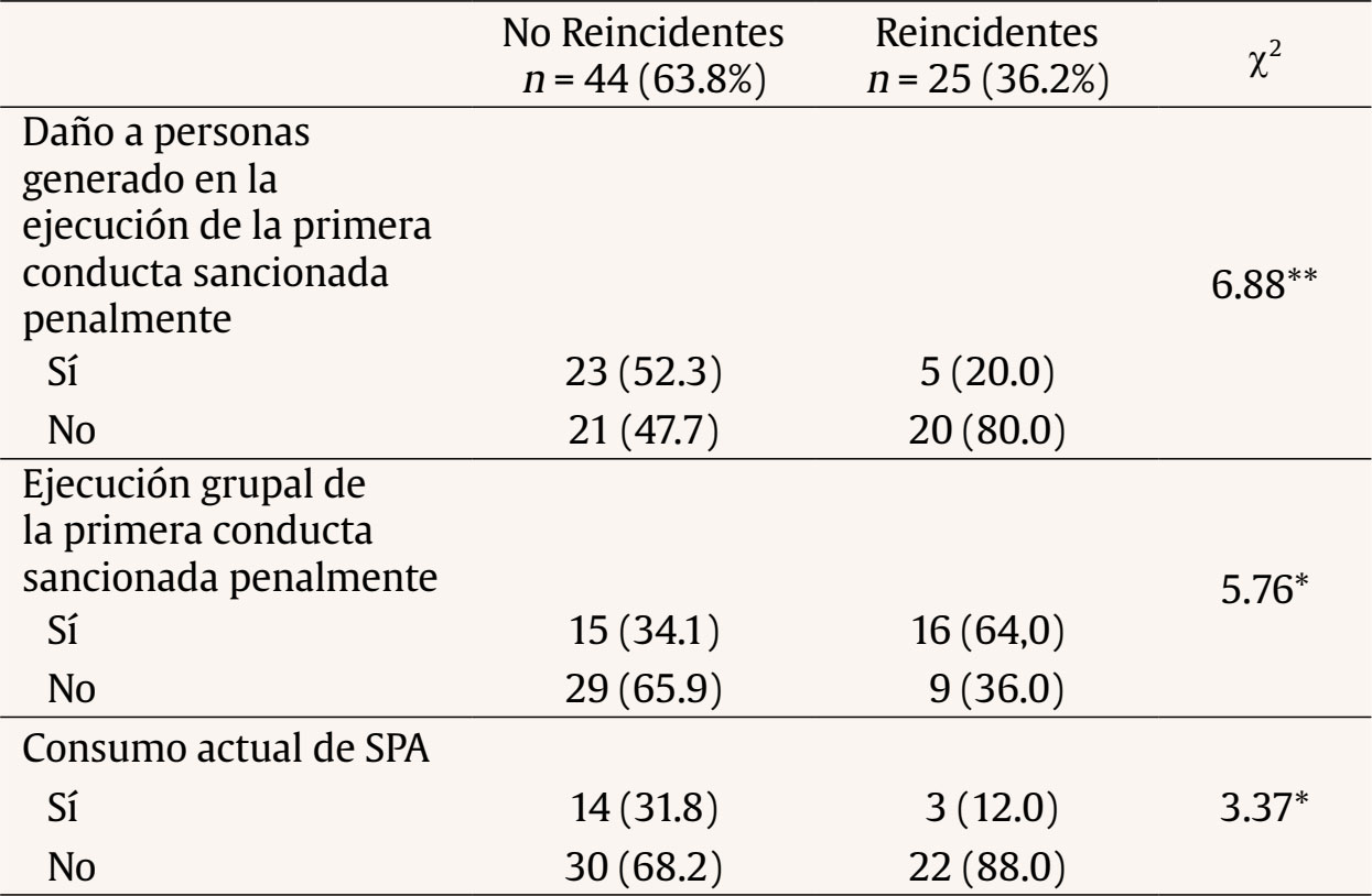 El presente artículo tiene como objetivo general comparar las características socio-criminógenas entre un grupo de internos que presentó reincidencia criminal de tipo penitenciario y otro grupo que no la presentó, tras tres años de seguimiento, durante los cuales permanecieron en libertad. La investigación ha sido de tipo no experimental, observacional/analítico, con alcance comparativo entre grupos. La muestra la componen 44 no reincidentes (63.8%) y un grupo de 25 reincidentes (36.2%). Se utilizó como instrumento de evaluación el Cuestionario de Reincidencia 7D-63, que evalúa el riesgo en la población penitenciaria colombiana. Los resultados del estudio permiten concluir que las principales diferencias entre los dos grupos fueron el consumo de SPA, el daño a personas producido por la primera conducta sancionada penalmente y la primera conducta grupal sancionada.