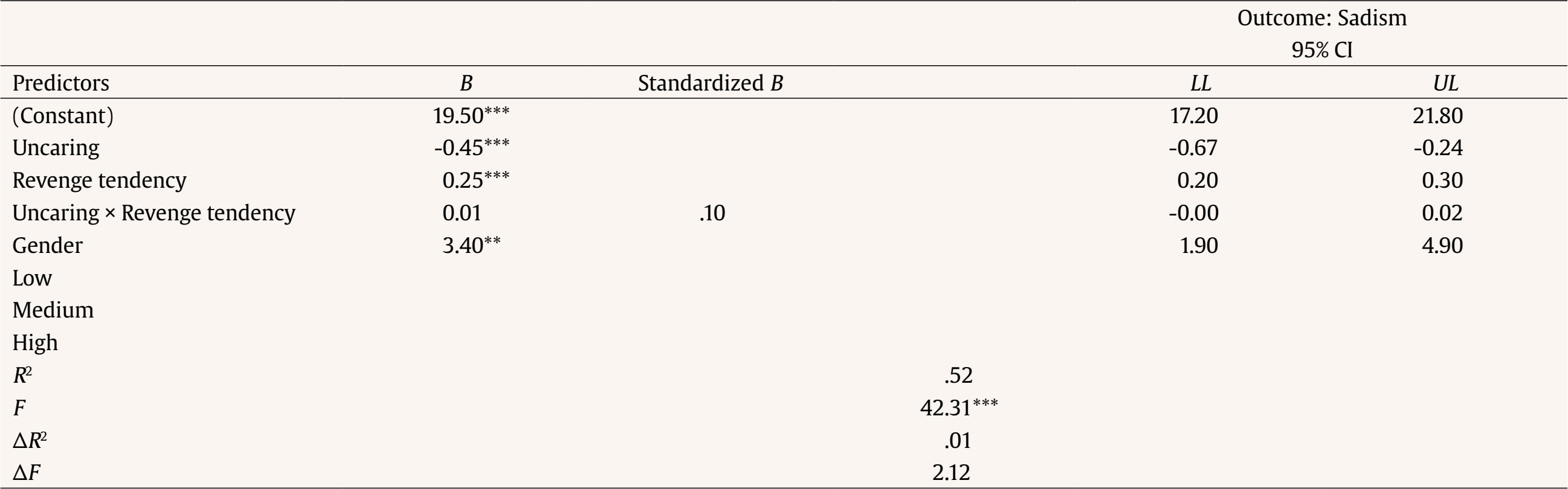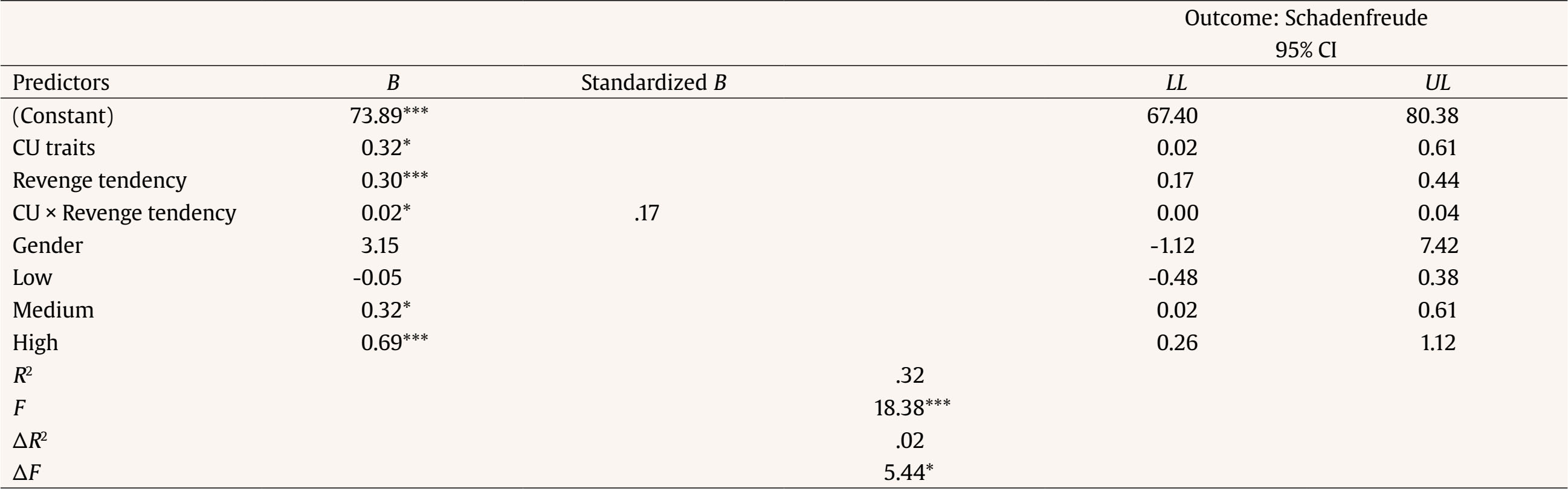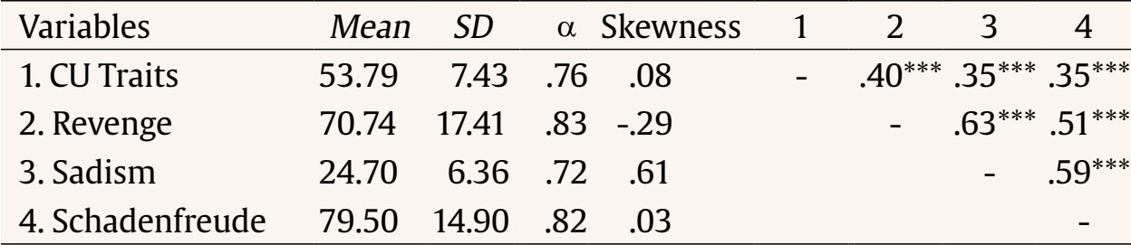 Correspondence: drsadiamalik13@gmail.com (S. Malik).Policing is a demanding profession that exposes officers to high-stress situations, frequent threats, and traumatic events. From restraining suspects to responding to crises, police constables must make rapid decisions under pressure, often in volatile and dangerous environments. The nature of police work not only necessitates psychological resilience and emotional regulation but also places officers at risk for maladaptive coping mechanisms. Research has shown that certain personality traits, such as emotional stability, conscientiousness, and resilience, facilitate effective adaptation in high-pressure occupations (Anshel, 2000; Salters-Pedneault et al., 2010). However, the same occupational stressors may also contribute to the development of maladaptive traits and behaviors, including emotional numbing, reduced empathy, and antisocial tendencies (Andersen & Papazoglou, 2015; Violanti et al., 2017). Callous-unemotional (CU) traits, characterized by a lack of empathy, remorse, and emotional sensitivity, have garnered attention as psychological constructs relevant to the behavioral functioning of police officers. These traits are core components of psychopathy and are established risk factors for the development of antisocial behavior (Frick & White, 2008). While CU traits have been primarily studied in clinical or juvenile populations, their manifestation in occupational settings, particularly in law enforcement, warrants further exploration. The psychological toll of repeated exposure to traumatic events, including violence, public hostility, and loss of life, may contribute to emotional desensitization and the reinforcement of CU traits among officers (Bakker & Heuven, 2006; Lucas et al., 2012). CU traits are associated with a range of antisocial outcomes, including sadism and schadenfreude. While often conflated, these constructs represent distinct psychological phenomena. Sadism refers to the deliberate infliction of psychological or physical harm to derive pleasure, control, or satisfaction (O’Meara et al., 2011). In contrast, schadenfreude involves passive enjoyment or amusement at another person’s misfortune, typically in the absence of personal involvement in the harm (Ben-Ze’ev, 2014). Although both are linked to reduced empathy, sadism involves active engagement in harmful acts, while schadenfreude reflects emotional detachment and pleasure from observation (Porter et al., 2014). Evidence suggests that individuals with elevated CU traits display impairments in emotion recognition, particularly for distress-related emotions such as fear and sadness, contributing to both sadistic tendencies and schadenfreude (Dawel et al., 2012; Erzi, 2020). Subclinical sadists, in particular, demonstrate a proclivity for cruelty, often pursuing harmful actions for intrinsic enjoyment rather than instrumental gain (Buckels et al., 2013). These individuals may even incur personal costs to inflict suffering, highlighting the severity of sadism as a form of interpersonal dysfunction (Campbell et al., 2004). Tendencies towards revenge may also mediate the interplay between CU traits and stress exposure. Revenge, defined as a motivated attempt to harm someone in response to perceived wrongdoing, differs from justice-oriented punishment in its emotional reactivity and personal nature (Yoshimura, 2007). While revenge can momentarily restore perceived fairness, it often perpetuates cycles of aggression and impairs emotional wellbeing (Zaibert, 2006). In some cases, sadistic behavior may be driven by revenge motives, particularly among individuals with high hostility or emotional dysregulation (Millon, 2011). Moreover, schadenfreude can serve as a form of “imagined revenge” when direct retaliation is not feasible (Leach & Spears, 2008), reflecting a passive outlet for unresolved grievance. Given the emotionally charged and adversarial nature of law enforcement work, Pakistani police constables operate in a unique sociocultural and occupational context that may exacerbate or shape the manifestation of these traits. High workloads, limited institutional support, and exposure to violence may intensify the expression of CU traits and associated behaviors (Forero et al., 2009). Understanding the potential moderating role of revenge in the relationship between CU traits, sadism, and schadenfreude is particularly important in this setting, as these psychological factors could influence officers’ ethical decision-making and interpersonal conduct. The current study investigates the influence of CU traits on schadenfreude and sadism among Pakistani police constables, with a specific focus on the moderating role of revenge tendencies. By contextualizing these relationships within a high-stress occupational environment, this study aims to advance our understanding of the psychological mechanisms underlying antisocial behavior in law enforcement. Furthermore, it seeks to inform the development of targeted interventions to promote emotional regulation, empathy, and ethical behavior among police personnel. Procedure Following approval from the relevant authorities, data collection for this study involved paper-based surveys distributed to police constables across various districts. To ensure informed participation, researchers first established rapport with potential participants by explaining the study’s purpose. Those who expressed interest then provided written informed consent before completing the questionnaire. Confidentiality of participant information was a primary concern, and researchers assured participants that their data would be used solely for research purposes. The questionnaire included demographic information and instructed participants to answer honestly and completely. Following these ethical procedures, data collection commenced from participating constables. Data and Sample A total of 217 police employees from the Punjab Police forc