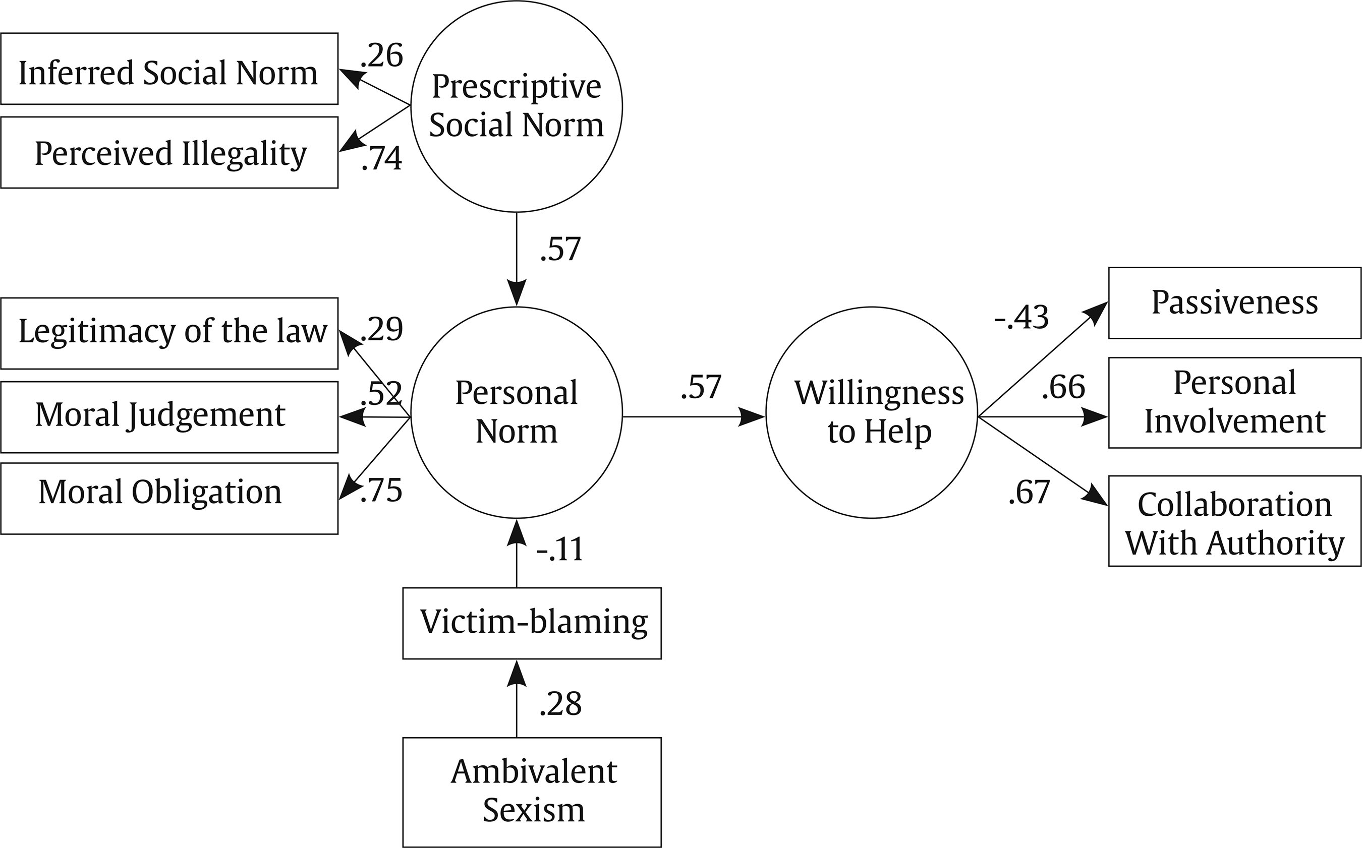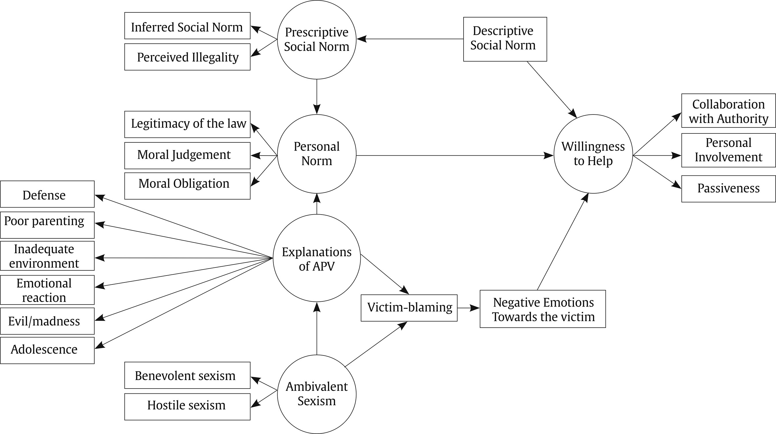 Correspondence: ammartin@ull.edu.es (A. M. Martín).Child-to-parent violence (CPV) is characterized by repeated behaviors of physical, psychological, or economic violence directed at parents or caregivers (Pereira et al., 2017). Research indicates that these behaviors primarily target mothers in community, judicial, and clinical samples (Holt, 2016; Simmons et al., 2018). However, there is no consensus on the perpetrators’ age range (Curtis et al., 2022) or on whether their main motivation is to exert control and power over their victims (Rogers & Ashworth, 2024). CPV has traditionally been one of the less researched types of family violence. However, its social and scientific visibility has increased in recent years due to the greater social alarm caused by media coverage of the problem since 2004 (Calvete & Pereira, 2019; Moreno & Legaz, 2025; Pereira, 2006). The turning point for the public interest in Spain was the reform of articles 153 (on abuse) and especially 173.2 (on habitual abuse) of the Spanish Penal Code, when the new Organic Law 11/2003 came into force. As a result of these legal modifications, the number of complaints for cases of CPV filed in the juvenile divisions of provincial prosecutors’ offices saw a sharp increase (Fiscalía General del Estado, 2004; Martín et al., 2022). The legal modifications of the Spanish Penal Code redefined CPV cases that were previously considered misdemeanors as crimes, requiring victims seeking civil protection measures to file a complaint. Therefore, reports for CPV related offenses increased, but not necessarily because the number of CPV cases went up. In fact, the number of complaints for CPV offenses subsequently stabilized and has remained stable ever since at around 4,000 per year (Fiscalía General del Estado, 2025). Beyond the high number of reports filed each year, the high proportion of CPV offenses compared to other offenses committed by minors (Cuervo, et al., 2025), or the prevalence of CPV in the general population (Junco-Guerrero et al., 2025), this social problem must also be addressed because of the negative consequences it causes. These negative consequences, that can impact the individual, family, and social spheres, have been well documented by psychologists, criminologists, and social workers, among other professionals. CPV has a particularly strong impact on mothers because they are the most frequent victims. They experience physical, psychological, and economic consequences that allow their children to control their lives (Arias-Rivera et al., 2022; Bautista-Aranda et al., 2025; Jiménez-Granado et al., 2023; Junco-Guerrero et al., 2025; Toole-Anstey et al., 2023, 2024). Since parents are consciously prone to dissimulate clinic symptomatology and give socially desirable responses in forensic contexts (Arce et al., 2025), the negative impact of CPV on mothers is likely worse than they report. CPV scientific literature has tended to address the problem by focusing on the identification of risk factors at different levels (Simmons et al., 2018), predominantly individual and family variables (Arias-Rivera & Hidalgo, 2020; Arias-Rivera et al., 2022; Chen et al., 2024; Cuervo, 2025; Junco-Guerrero et al., 2025). Just recently, social and professional demands for effective interventions have shifted the focus from single variables to profiles of adolescents involved in this type of violence (Calvete, 2023; Cano-Lozano et al., 2023). Although such knowledge is essential to approach the phenomenon, variables that would move the focus away from the family and contextualize this violence in the broader scenario in which it occurs are also needed to have a better understanding of CPV as a social problem (Holt, 2021; Martín & Cortina, 2025). Parents are reluctant to report CPV and seek help, as they experience complex and contradictory feelings, wanting to protect their children and deal with the problem privately (Arias-Rivera et al., 2022; Toole-Anstey et al., 2023). In addition, they feel constantly judged, stigmatized, and blamed, both in their close environment and within professional settings when seeking protection and resources (Toole-Anstey et al., 2023). This lack of support is related to revictimizing and victim-blaming discourses (Cortina & Holt, 2024; Toole-Anstey et al., 2023) that can lead to social isolation (Bautista-Aranda et al., 2025; Jiménez-Granado et al., 2023; A. Hernández et al., 2020; A. Hernández & Martín, 2025). On the contrary, social support plays a mediator role in the relationship between CPV and mothers’ psychological disorders (Bautista-Aranda et al., 2025). In dating violence cases, a victim’s willingness to seek help has been related to the perceived severity of that violence (Arrojo et al., 2024). In this line, Rogers and Ashworth (2024) have stressed the need for research to focus on the barriers to and facilitators of help-seeking by CPV victims. However, to the best of our knowledge no study has yet explored the variables related to people’s willingness to help CPV victims. The Present Study This study aims to hypothesize and empirically test a conceptual model on the willingness to help CPV victims, proposing theoretical relationships between six psychosocial variables: (1) social norms regarding CPV, (2) personal norms against CPV, (3) explanations of CPV, (4) ambivalent sexist attitudes, (5) attribution of blame to the victim, and (6) negative emotions towards the victim. The selection of these variables was based on a review of previous research on the impact of norms, attribution, and willingness to help victims in general (e.g., Gracia et al., 2018; Malle, 2023, 2025; Wenzel & Woodyatt, 2025), as well as the evidence provided by the few studies that explore the social perception of CPV (Cortina & Holt, 2024; Cortina et al., 2022; Cortina & Martín, 2020, 2023). Figure 1 reflects the proposed model. The selection of the variables and the hypothesized relationships betw