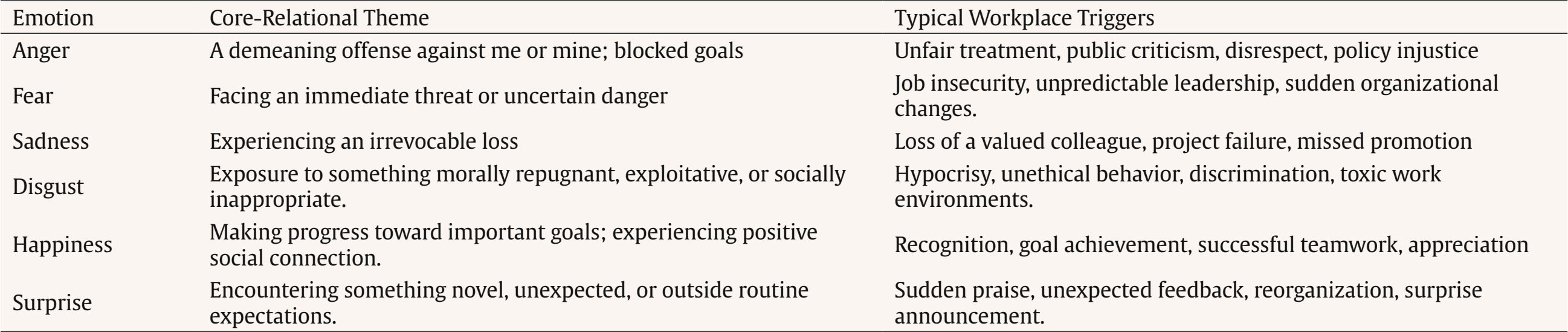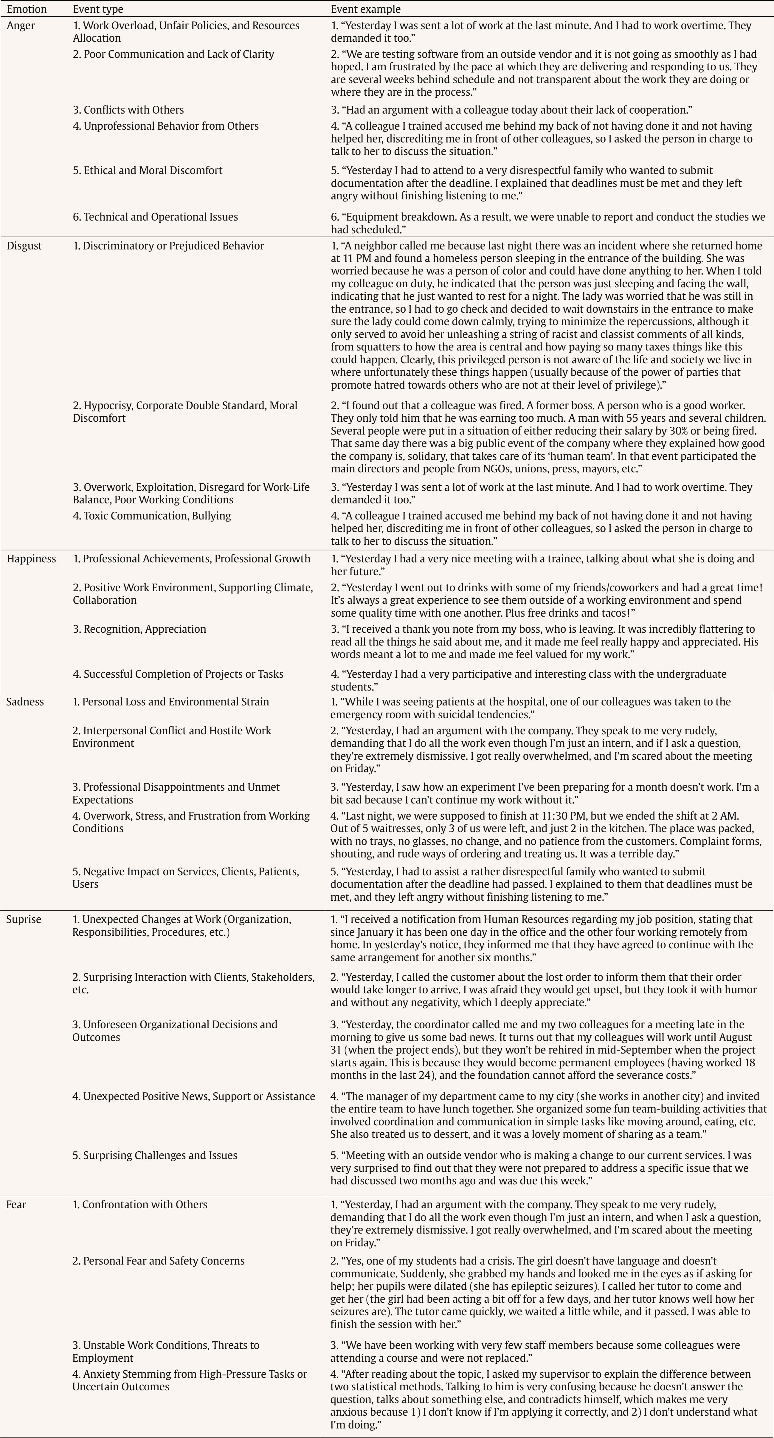 Correspondence: j.navarro@ub.edu (J. Navarro).From its earliest formulations, organizational theory has acknowledged that decisions and behaviors are shaped by human limits and context rather than perfect rationality (March & Simon, 1958). Over time, research has increasingly highlighted that these limits are not only cognitive but also emotional (Barsade et al., 2003). By incorporating affective processes into models of work behavior—and by using intensive, event-based methods—scholars have developed a more complete picture of how employees interpret and respond to the events that punctuate their working lives (Beal et al., 2005; Weiss & Cropanzano 1996). Despite substantial progress, there remains a need for more precise knowledge about which emotions employees experience at work, how intensely they feel them, and what specific events trigger these affective responses. Although affective phenomena are now well established as integral to organizational behavior, research has often examined them in terms of broad affective dimensions (e.g., positive vs. negative affect), which can obscure important distinctions among specific discrete emotions. Emotions such as anger, fear, or sadness, though sharing negative valence, differ markedly in their antecedents, appraisals, and behavioral implications. Understanding these nuances is essential for theory and for designing interventions aimed at improving employees’ emotional well-being. Recent studies have increasingly adopted within-person, longitudinal, or diary designs to capture the dynamic nature of discrete emotions at work (e.g., Barclay & Kiefer, 2019; Rispens & Demerouti, 2016). These approaches have shown that emotional experiences fluctuate substantially across days and events, supporting the idea that emotions should be examined as transient states rather than stable dispositions. However, existing research has rarely considered how specific characteristics of work events—notably their valence (positive or negative meaning) and strength (relevance, novelty, and disruption)—jointly determine the occurrence and intensity of different emotions. Moreover, few studies have systematically identified the types of workplace events that tend to elicit particular basic emotions. The present study addresses these gaps by integrating the Affective Events Theory (events as proximal causes of affect), the Event Systems Theory (features that make events salient, notably event strength), and the Appraisal Theory (evaluations that determine event valence and emotion-specific core-relational themes) to explain when and why discrete emotions arise at work. Using a within-person diary design, we examine the frequency and intensity of six basic emotions in daily work (RQ1), test how event strength and valence (and their interaction) predict these emotions (H1–H5), explore individual differences—with gender specified a priori as an exploratory moderator given mixed prior evidence (RQ2), and identify event categories that commonly trigger each emotion (RQ3). This design would clarify the dynamic, event-based mechanisms through which workplace experiences shape discrete emotional responses. By focusing on discrete emotions, event characteristics, and within-person variability, this research contributes to a more fine-grained understanding of affective experiences at work. It also provides empirical support for recent theoretical developments that integrate the Affective Events Theory with the Event Systems Theory (e.g., Liu et al., 2023), and further extends these frameworks by clarifying whether the interaction between event valence and event strength produces emotional outcomes. Ultimately, this study advances theory and practice by illustrating that workplace affect is richer than a simple positive-negative divide and by revealing how organizations can shape emotional climates through the everyday events employees encounter. Theoretical Background Emotions Emotions are brief affective responses to personally meaningful events that involve experiential, physiological, and behavioral components (American Psychological Association [APA, 2020]; Lazarus, 1991). They differ from moods, which are longer-lasting and not tied to specific causes. In organizational research, emotions are particularly important because work is an inherently social and goal-driven environment where daily events continually elicit affective reactions (Ashkanasy & Dorris, 2017; Fitness, 2000). Although prior studies have often examined affect in broad positive-negative terms (e.g., Watson et al., 1988), growing evidence indicates that such global measures can obscure meaningful distinctions among discrete emotions such as anger, sadness, fear, and happiness (Barclay & Kiefer, 2019; Gibson & Callister, 2010; Weiss & Beal, 2005). In fact, emotions sharing the same valence can have distinct implications for organizational outcomes. For example, a meta-analysis by Shockley et al. (2012) showed that sadness was negatively related to task performance (r = -.28), whereas anger was positively associated with counterproductive behaviors (r = .27). Importantly, these associations were emotion-specific: sadness did not show a significant relationship with counterproductive behaviors, nor did anger with task performance, highlighting that discrete emotions—despite sharing a valence—differ markedly in their consequences. Moreover, emotion theorists such as Lazarus (1991) and Frijda (1986) have also repeatedly documented that emotions differ in their antecedents. Consequently, research has increasingly emphasized discrete emotions as unique responses with distinct antecedents and outcomes. Building on this view, the present study integrates complementary theoretical perspectives that clarify how workplace events generate specific emotional experiences. The Importance of Events as Causes of Emotions at Work The Affective Events Theory (AET) proposed by Weiss and Cropanzano (1996) is