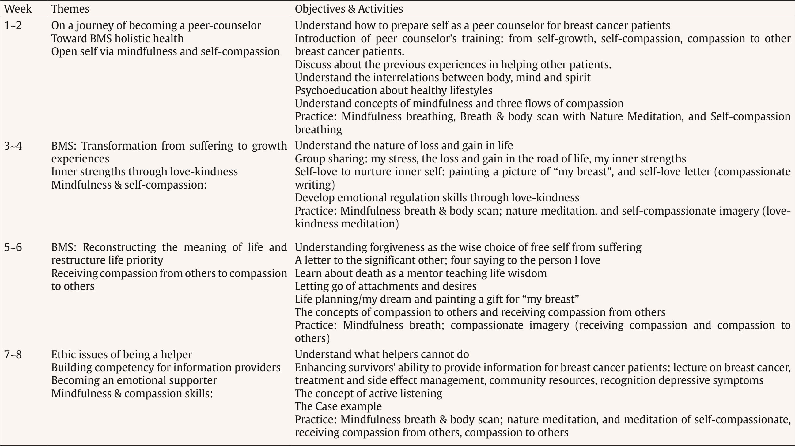 Correspondence: cchsieh1116@gmail.com (C.-C. Hsieh).Breast cancer is the most common cancer among women, with approximately 20 million new diagnoses annually (World Health Organization, 2021). Advances in early screening and novel treatments have contributed to high survival rates. As a result, an increasing number of breast cancer survivors are engaging in volunteer work, offering peer support in hospitals or through non-profit organizations. Systematic reviews have demonstrated that peer support programs can significantly improve the psychological adjustment of newly diagnosed breast cancer patients or those undergoing active treatment (Hu et al., 2019). Nevertheless, providing peer support may expose survivors to empathy-based stress—emotional strain resulting from secondary or indirect trauma experienced through empathic engagement with others (Rauvola et al., 2019, p. 299). This exposure, coupled with their own past trauma and fear of cancer recurrence, may negatively impact on their well-being. Cultivating mindfulness self-compassion skills has been shown to alleviate empathy-based stress and improve emotional resilience (Jennings & Min, 2023). The review study by López-Contreras et al. (2024) showed that compassion-based interventions primarily focus on enhancing mindfulness and self-compassion skills among breast cancer patients to reduce emotional distress and improve quality of life. To date, however, these interventions have not been applied for breast cancer survivors learning about coping with the empathy-based stress they might experience when providing peer support to newly diagnosed patients. The impact of compassion training on their perceptions of compassion competency to others is also not well-examined. Therefore, there is an urgent need to develop mindfulness compassion programs specifically tailored for breast cancer survivors who are interested in becoming peer supporters. The peer counselor refers to someone who is trained and supervised in breast cancer survivors, providing information and emotional support and assisting newly dianogsed breast cancer patients to find community resources (Giese-Davis et al., 2006; Giese-Davis et al., 2016). Giese-Davis et al. (2006) and Giese-Davis et al. (2016) developed a peer counselor’s training program via group format, which consisted of a lecture from an oncologist about breast cancer treatments, a nurses’ lecture about side effect managements, a lecture on active listening skills, and a role play in learning how to do active listening. They observed that breast cancer survivors’ emotional suppression increased after they provided peer counseling for patients. Their tendency toward emotional suppression may reflect the insufficient emphasis on self-care and emotional regulation skills in current peer-counselor training programs (Lu et al., 2014; Moon et al., 2017; Schover et al., 2011; Toija et al., 2018). Therefore, peer-counselor training needs to strengthen breast cancer survivors’ self-compassion skills to better support newly diagnosed patients. Self-compassion consists of self-kindness without self-judgment, mindful awareness of painful feelings, and recognition that suffering is a common human experience (Neff, 2023). Breast cancer-related stimuli can intensify patients’ negative interoceptive sensations and dysfunctional cognitive appraisals, such as a negative body image and fear of cancer recurrence (Sebri et al., 2020). Unlike cognitive-behavioral interventions, which focus on modifying irrational or dysfunctional thoughts and identifying the sources of negative or fear-laden internal sensations, self-compassion interventions cultivate mindful and non-judgmental awareness of the self. This approach can foster more positive interoceptive experiences and enhance feelings of bodily reassurance and self-concept (Sebri & Pravettoni, 2023). A review of nine RCTs by López-Contreras et al. (2024) found that compassion-based interventions have positive outcomes for breast cancer patients, including reductions in depression and anxiety, improvements in coping skills (mindfulness and self-compassion), and enhanced quality of life. These interventions mainly include activities such as self-kindness meditation and writing, mindful awareness and savoring of positive events, gratitude practices, and acts of self-kindness. While most compassion-based interventions focus on cultivating self-compassion, few incorporate trainings in compassion to others. For peer counseling programs, both self-compassion and compassion to others are essential for helping breast cancer survivors develop the emotional regulation skills needed to cope with empathy-based stress. According to Gilbert et al.’s (2017) emotional regulation model, compassion operates through three flows: self-compassion, compassion from others, and compassion for others. These flows are moderately correlated, suggesting that increases in self-compassion may strengthen one’s capacity to show compassion toward others. Compassion-Focused Therapy (CFT) aims to cultivate skills in all three flows—being compassionate toward oneself, receiving compassion from others, and extending compassion to others—to enhance feelings of inner warmth, safety, and soothing within the emotional regulation system (Gilbert, 2014, 2017). Evidence shows that CFT can reduce depressive symptoms among breast cancer patients (Dodds et al., 2015; Gilbert & Choden, 2014; Sadeghi et al., 2018). Through CFT, breast cancer patients may respond to bodily changes with greater flexibility and increase compassion toward both themselves and others. Given the observed correlations between self-compassion and compassion to others (Gilbert et al., 2017), it remains unclear whether the mechanisms underlying the effects of compassion-based programs operate through changes in mindfulness, self-compassion, and compassion to others, ultimately influencing breast cancer survivors’ quality of life an