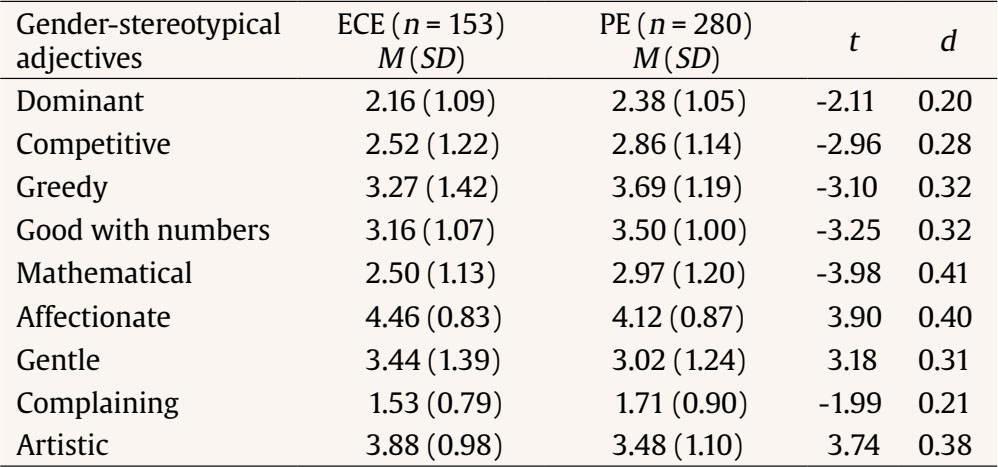 Teaching is one of the scenarios in which gender segregation is most visible, finding a higher number of women in this profession. Thus, the choice of the future university degree seems to be closely related to gender stereotypes. Therefore, the aim of this study is to know whether students of Early Childhood and Primary Education have gender stereotypes related to their future profession. The total sample of the study is constituted by 433 students (323 women and 110 men). Gender-stereotype adjectives were presented to them, and they were asked to rate the importance they granted the adjectives in relation to their future career. Adjectives such as “compassionate”, “delicate”, and “artístic” were rated as much more important in females and in those who studied Early Childhood. Therefore, our results suggest that our sample perpetuates both the gender stereotypes and the representations that underlie teaching career.